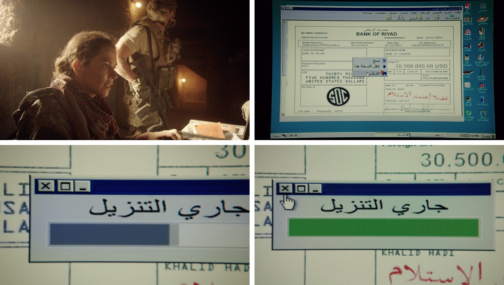 Custom interactive Windows 95 interface and files, in Arabic. The computer screen is being operated by our leading actress, who finds this computer during a military raid.