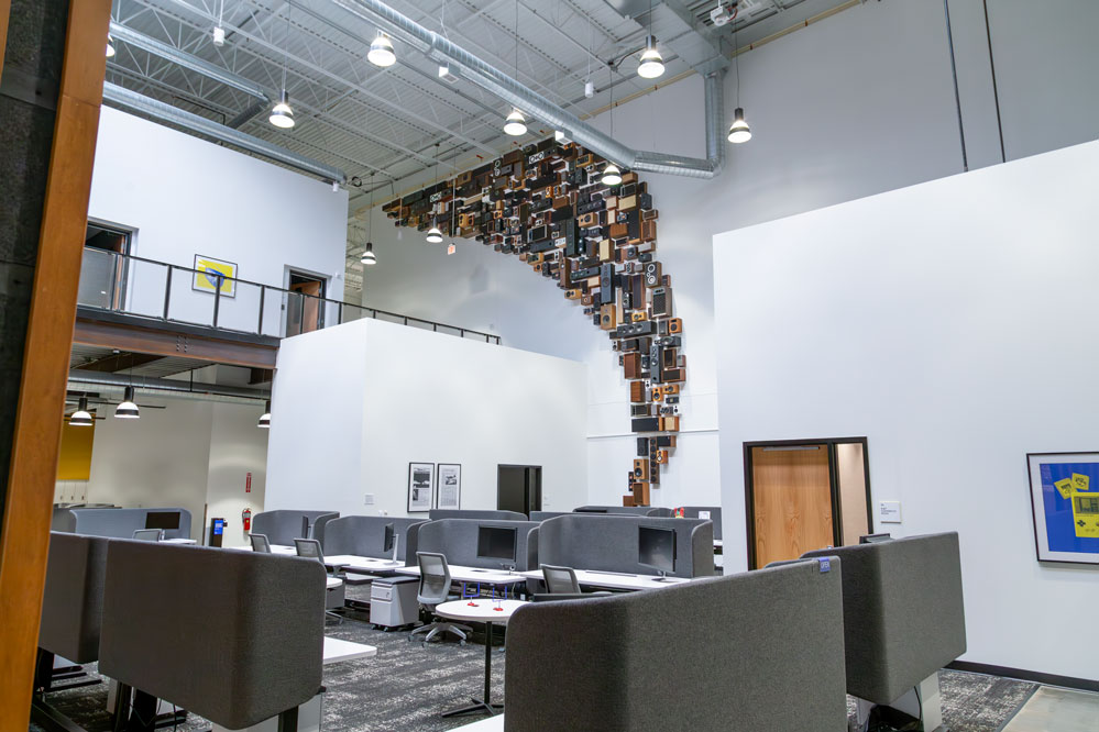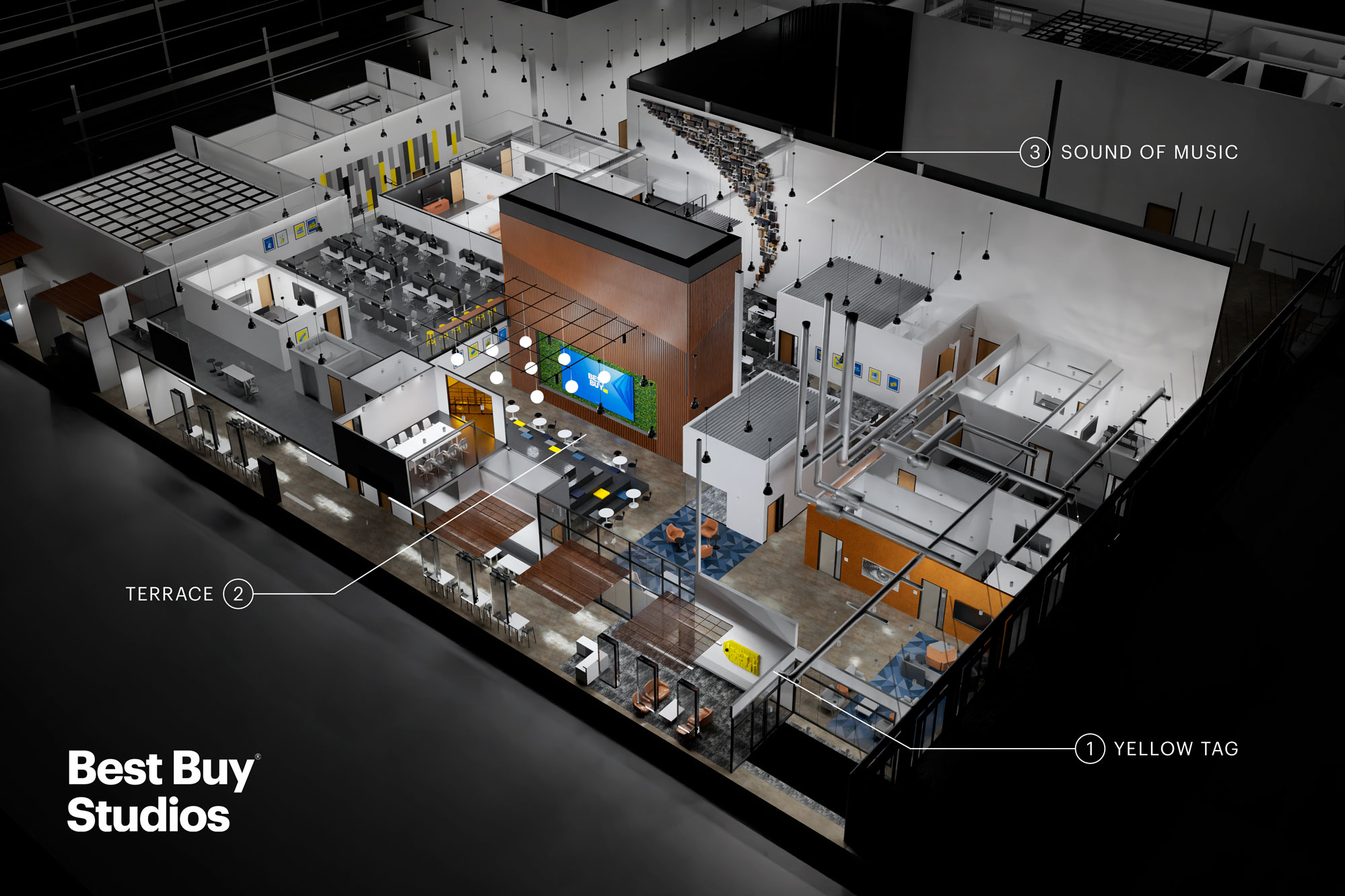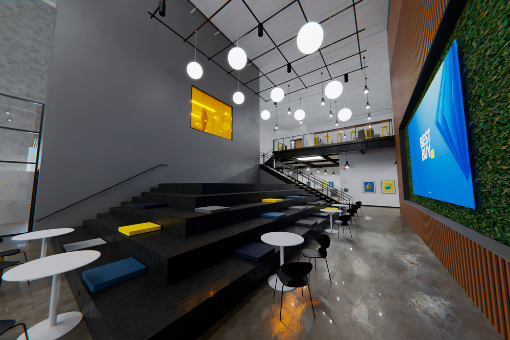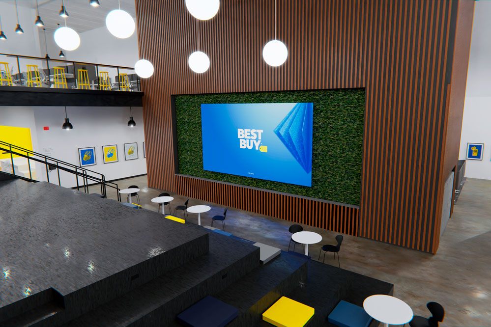Past the terrace's video feature wall, you'll find work stations and a monumental sculpture of a tornado, symbolically championing the incredible origin story of Best Buy