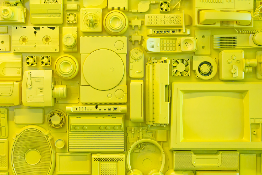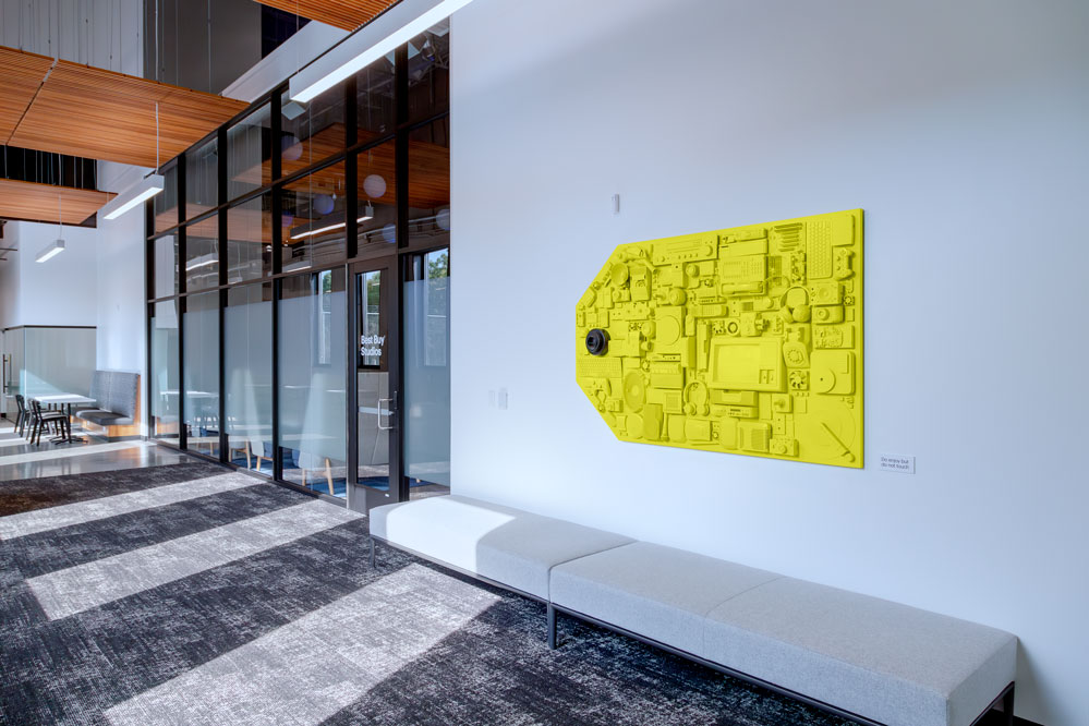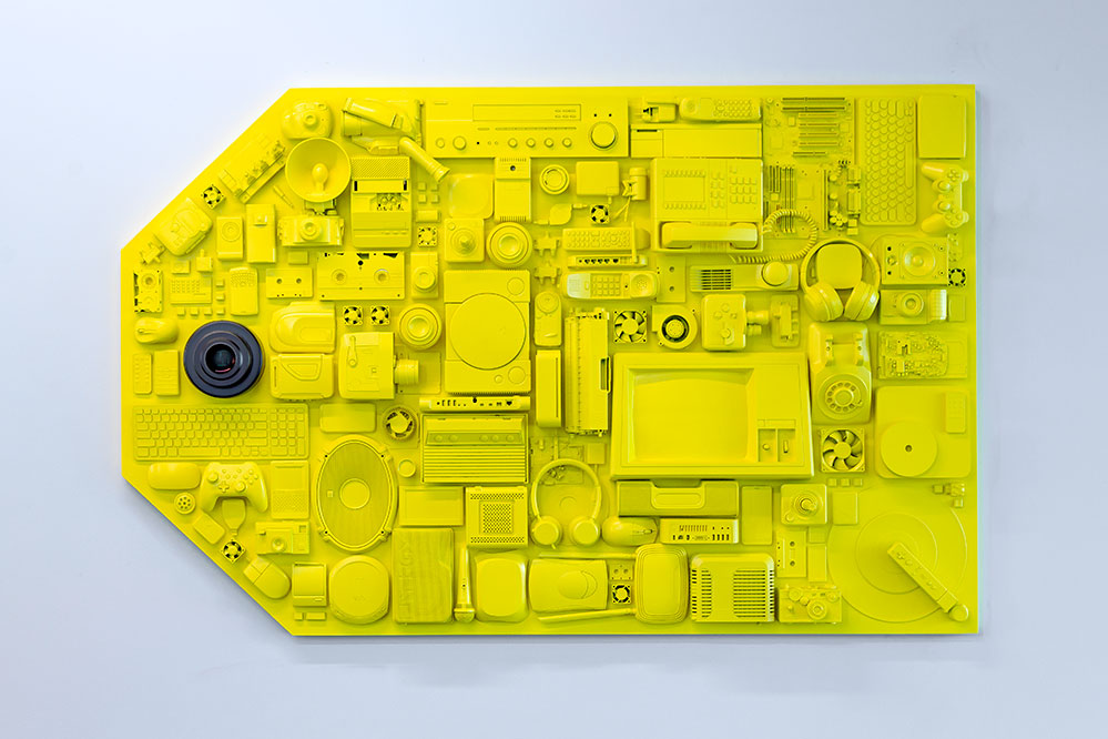 ... the Yellow Tag artwork is made entirely out of recycled vintage technology, painted electric yellow, and accented with a photo lens forming the black pinhole of the Best Buy logo.